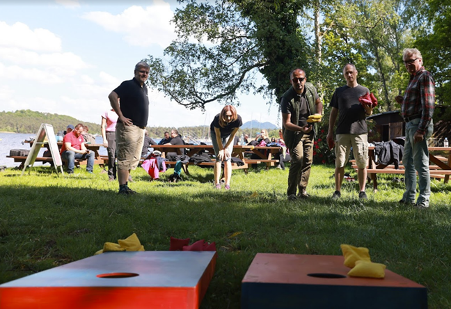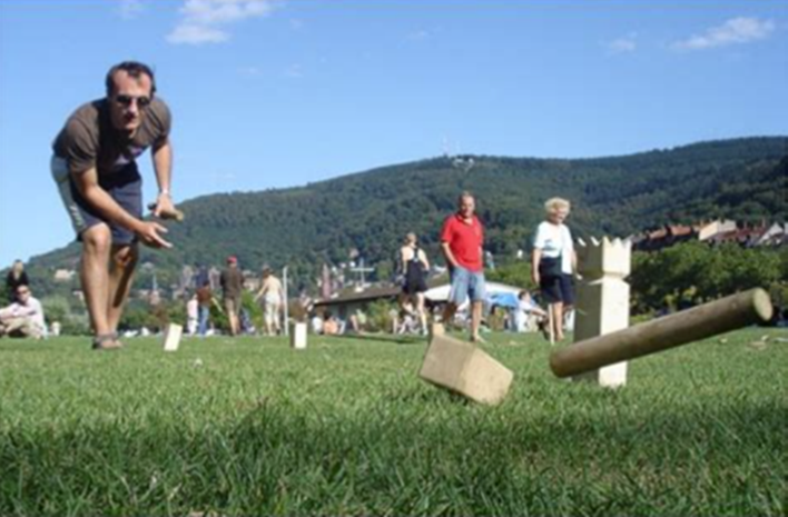 Tradiční švédská hra. Hráči shazují dřevěné špalíky házecími kolíky.
